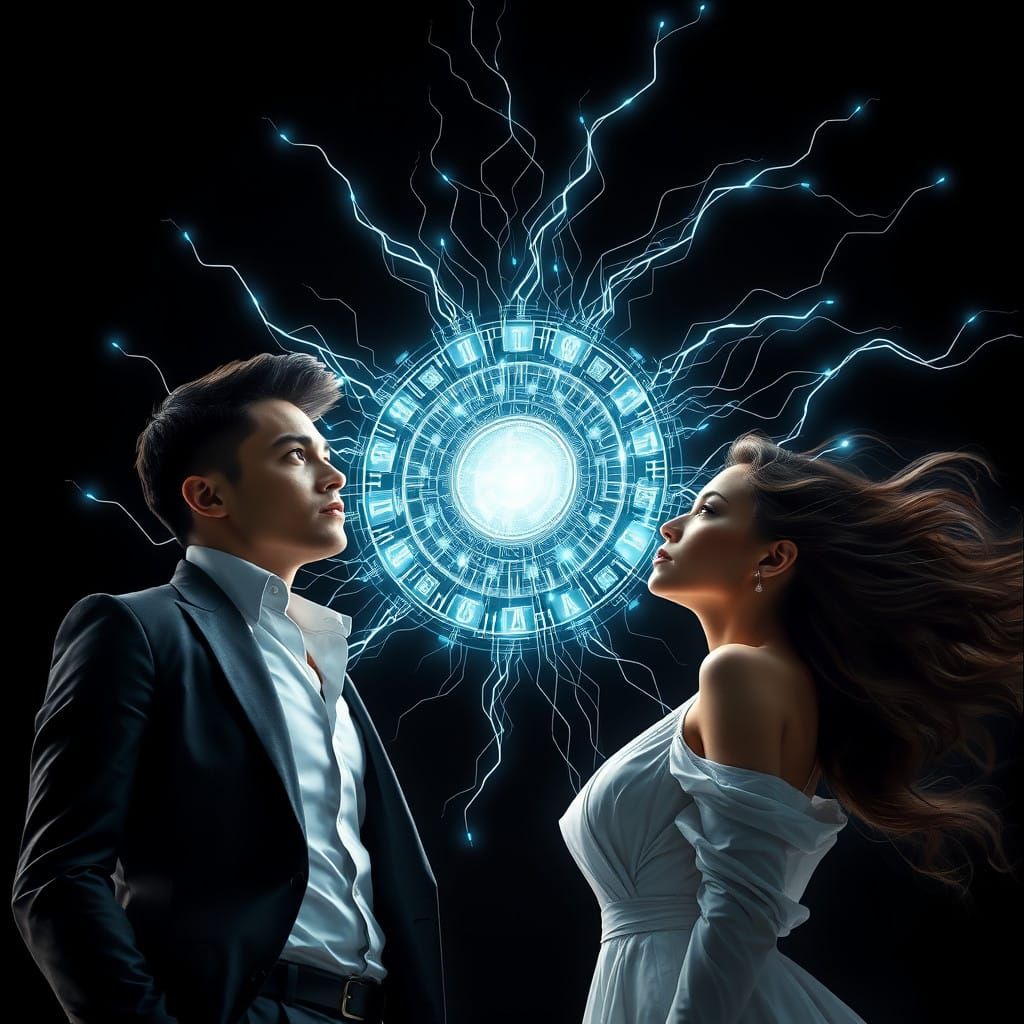 This image shows a futuristic duo standing in awe of a glowing, ethereal AI wealth system, rendered in a hyper-detailed, matte painting style with deep, rich colors and intricate patterns, reminiscent of high-concept art from Unreal Engine 5.
