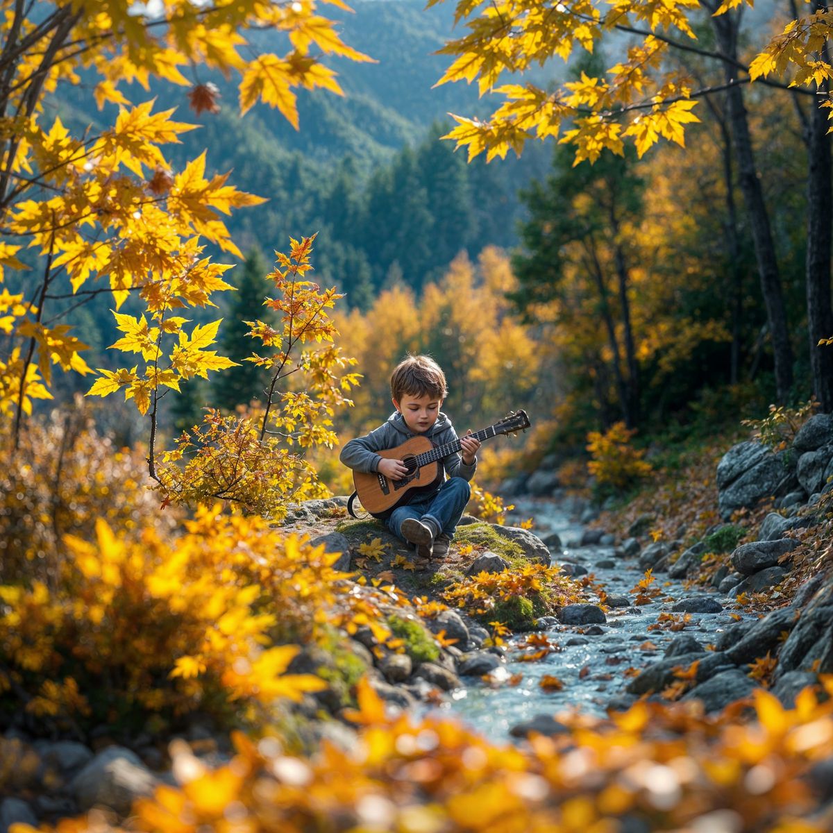 A detailed photograph captures a miniature autumn landscape with vibrant trees and a boy playing guitar amidst falling maple leaves. Sunny, high-resolution nature photography.