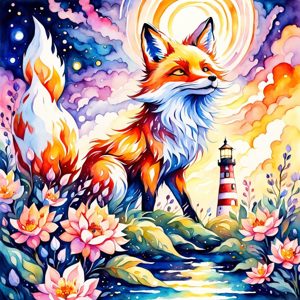 This whimsical watercolor illustration features a cosmic flower fox near a lighthouse, bathed in warm golden light, creating a serene and dreamy fantasy atmosphere.