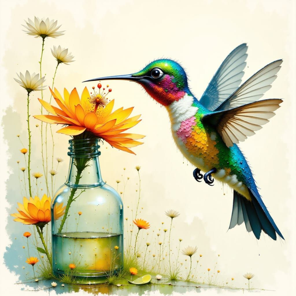 A delicate watercolor image showing a hummingbird feeding. The vibrant colors and soft lighting create an ethereal atmosphere, with sunlight glinting off its feathers. The artwork features intricate details.