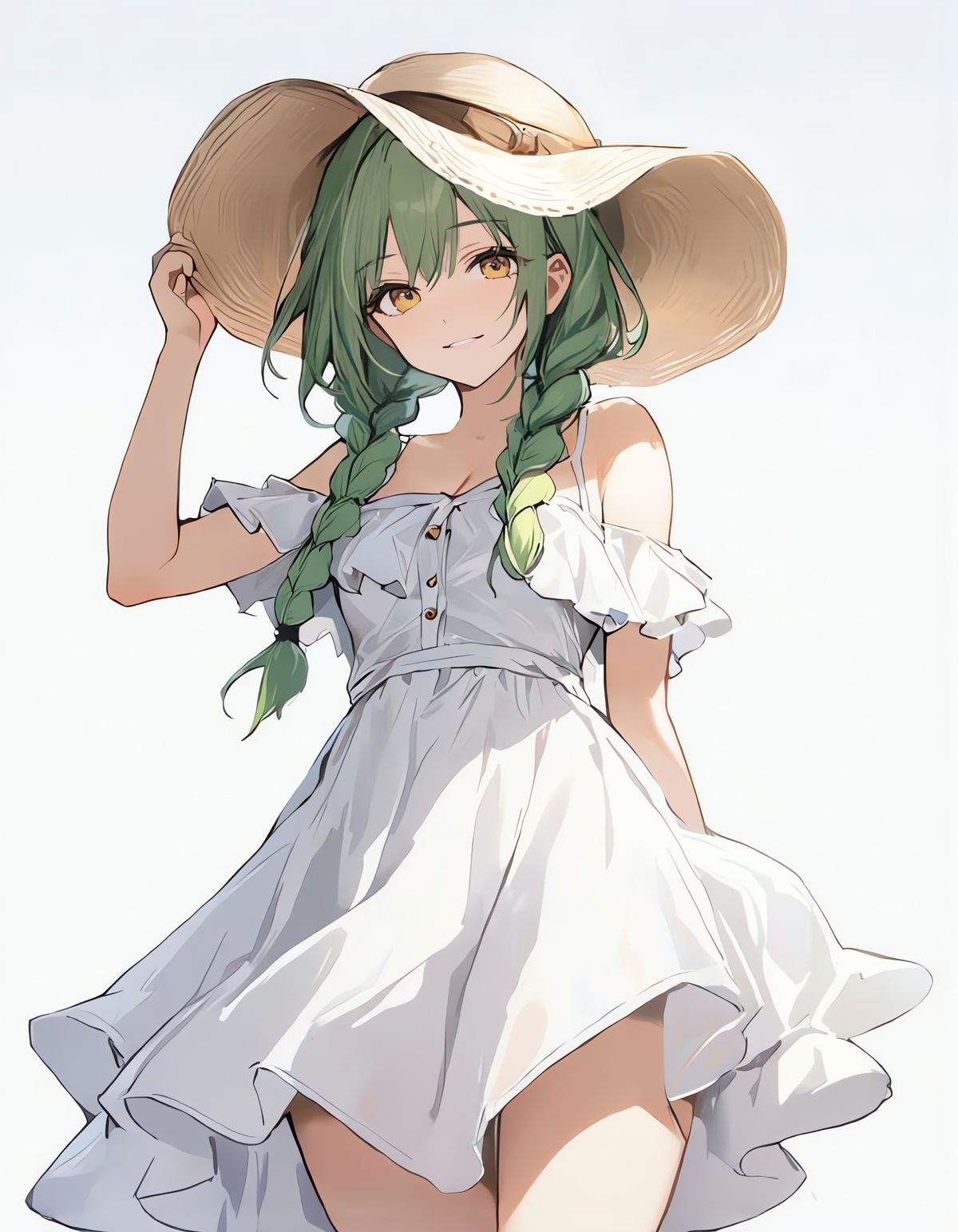 A sun-kissed girl in a sundress and sunhat smiles gently. This image showcases a solo female figure with long green hair in twin braids against a clean white backdrop.