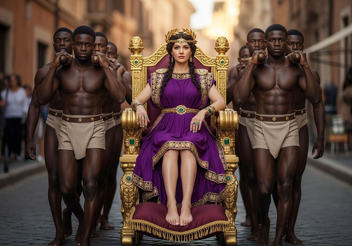 This image shows Empress Messalina on an emerald and gold throne, carried through ancient Rome. Soft focus and natural lighting enhance the rich purple and gold toga, rings, and bracelets.