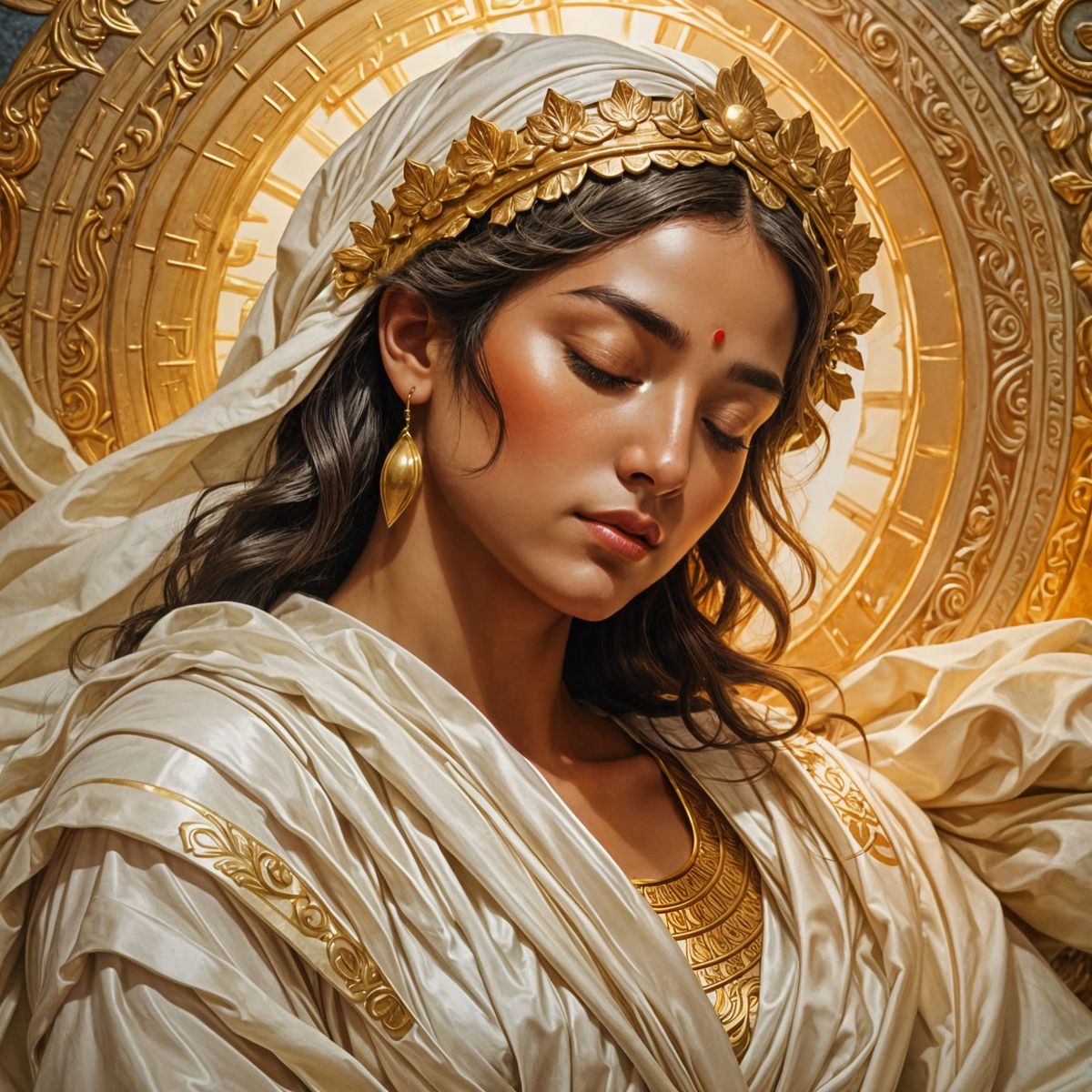This image shows a sleeping female goddess adorned in a white toga. The artwork evokes classical sculpture with its serene and elegant depiction of the deity.