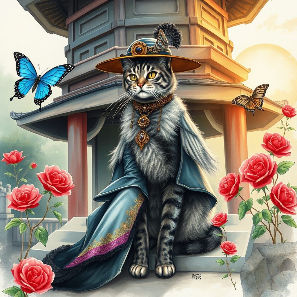 A striking picture of a steampunk tabby cat in a dress and hat, posing in a Japanese Zen garden. The artwork features soft brushstrokes, textures, and a muted, powerful Asian color palette.