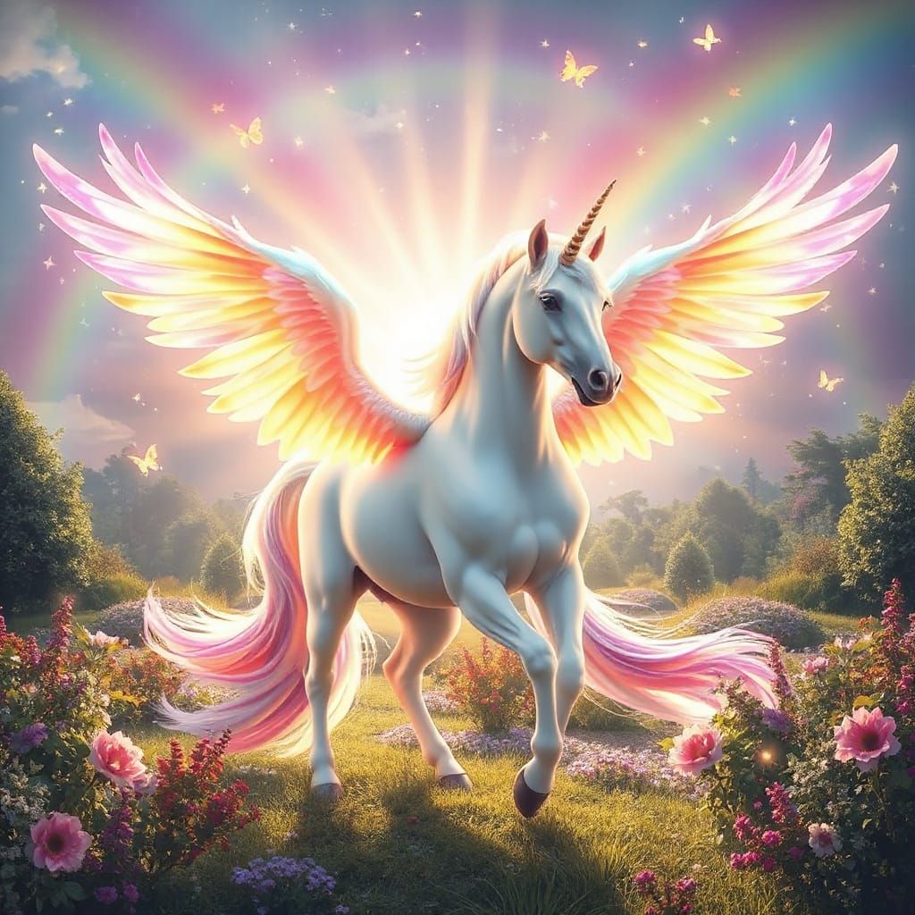 This image shows a celestial alicorn exuding magic in a rainbow garden. The scene is filled with soft orbs of light and butterflies, enhancing the otherworldly, wondrous beauty of the creature.