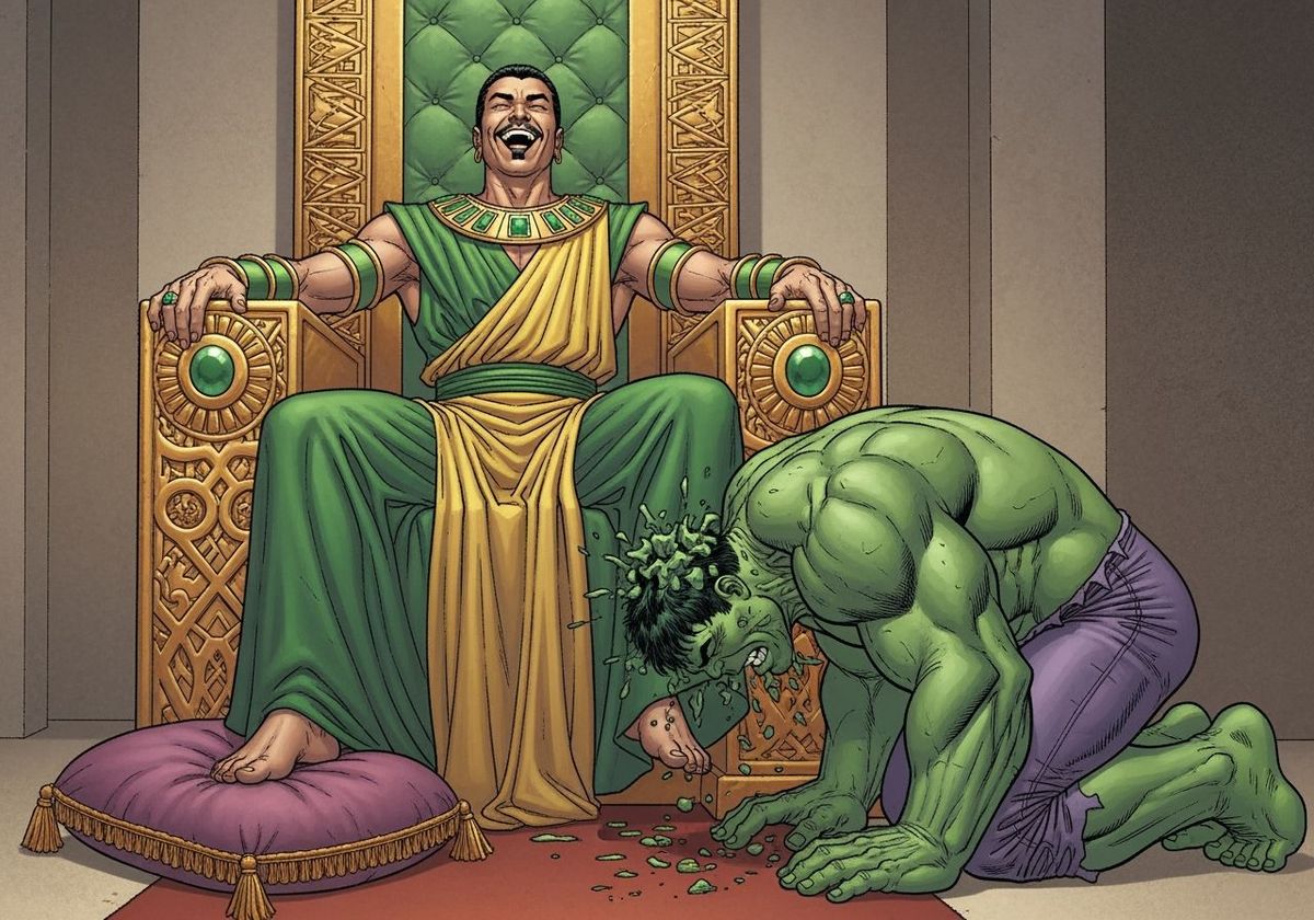 This image shows the Marvel villain Mandarin seated on a throne, adorned in a green and yellow toga and his ten rings. The Hulk kneels before him, in a hyperrealistic Marvel Comics style.