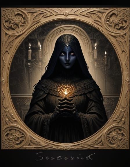 This image is a haunting portrait of a woman in a dimly lit, ornate chamber, surrounded by mysterious symbols and the soft glow of candelabras. She holds a worn tarot card, exuding an air of mystique and mystery in a dark, dreamlike atmosphere.