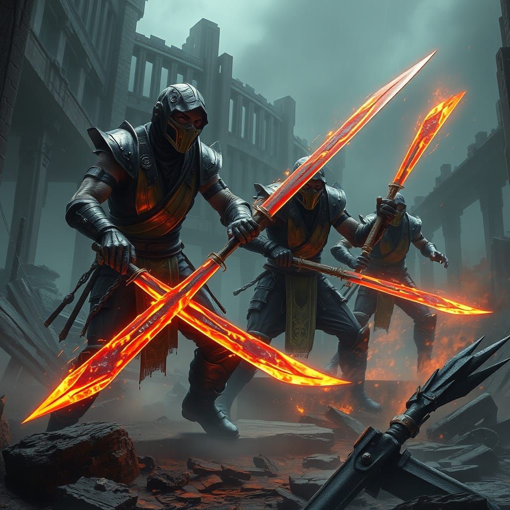 A digital matte painting of Mortal Kombat warriors battling in a ruined arena. They are clad in cybernetic armor, wielding glowing blades, set against an apocalyptic backdrop with eerie mist.