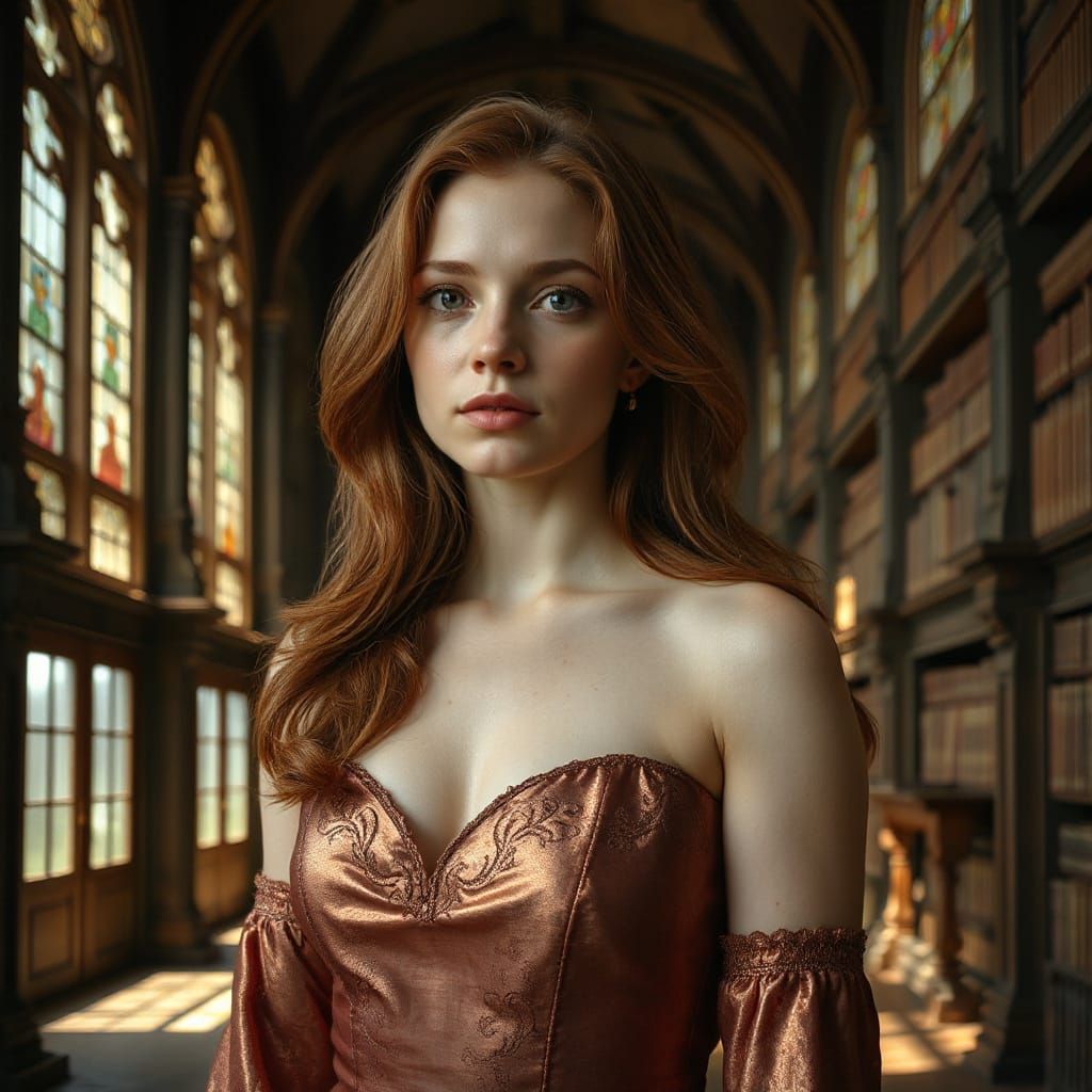 This image shows a red-haired woman with freckles in a medieval library. Sunlight illuminates her elegant gown in the style of the Dutch Masters, using dramatic chiaroscuro.