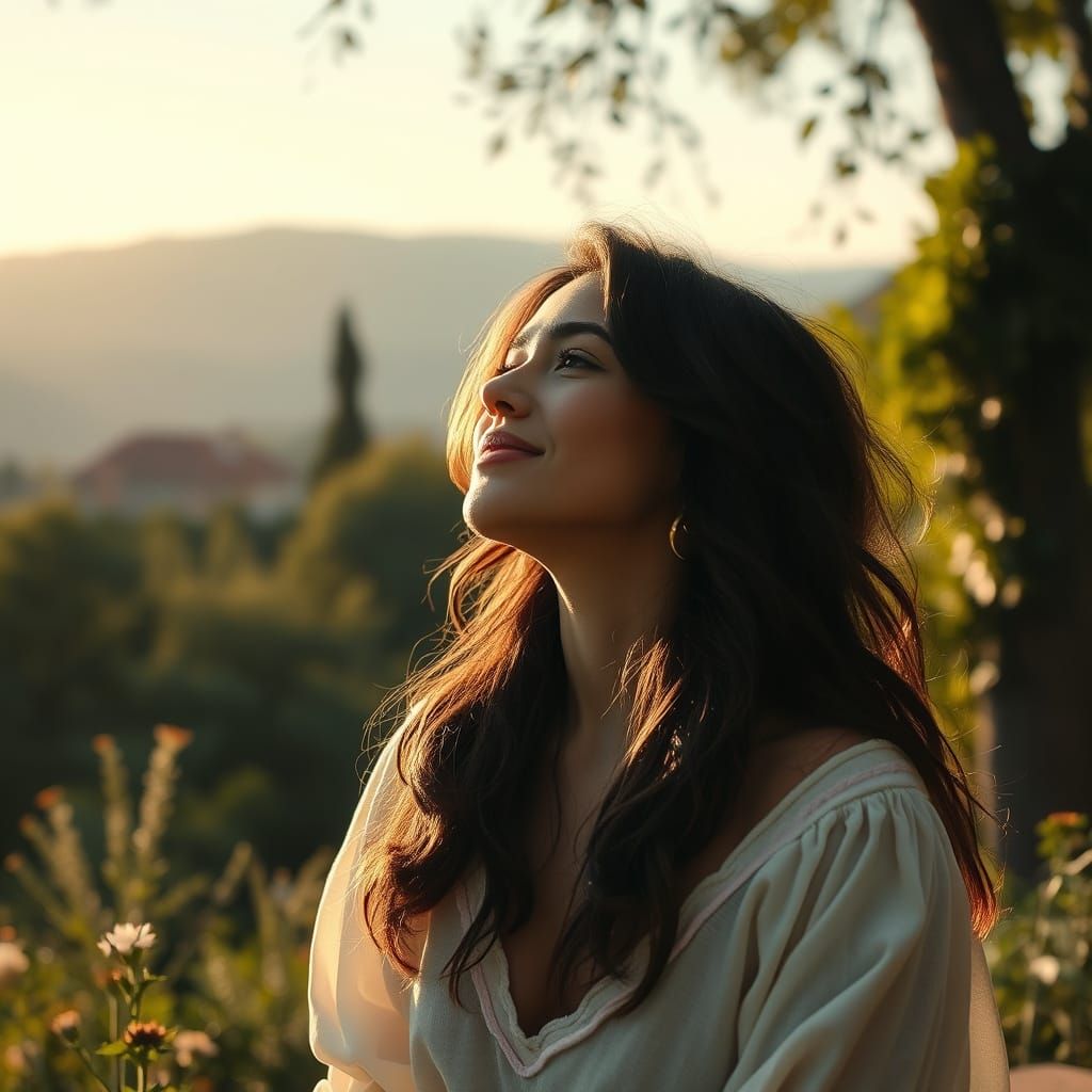 A serene woman basks in the radiant warmth of a sunny morning, surrounded by vibrant greenery and delicate details, evoking a sense of cinematic tranquility.