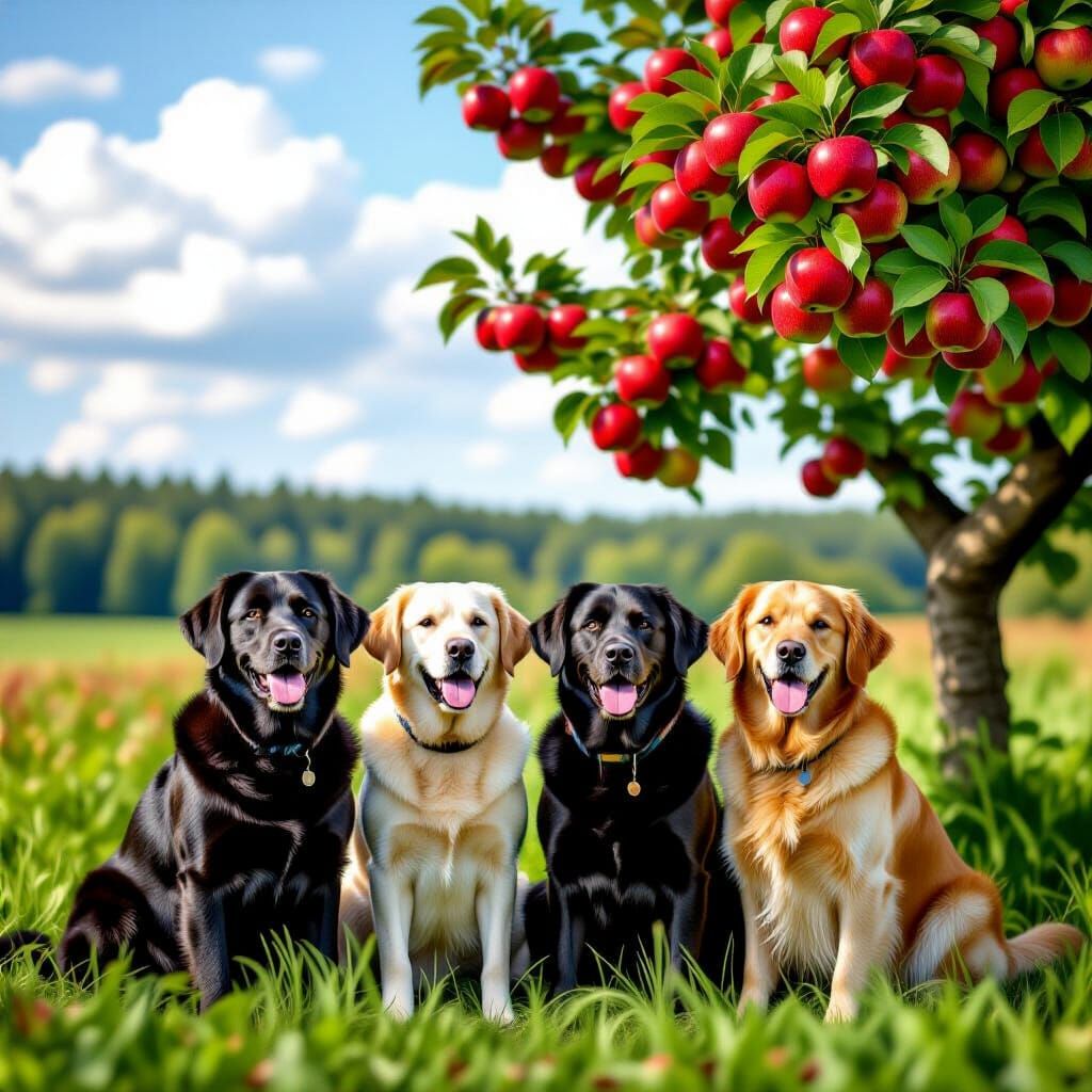 This image shows four happy labradors—black, yellow, chocolate, and golden—sitting in a vibrant green field. Behind them is a majestic apple tree full of red apples, all under a bright blue sky in photorealistic style.