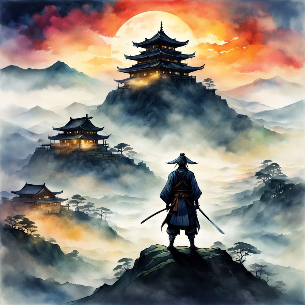 A surreal image shows a spectral samurai on a mountain overseeing a village. The vibrant watercolor image is enhanced by a misty aura and golden light, creating a dreamlike aesthetic.
