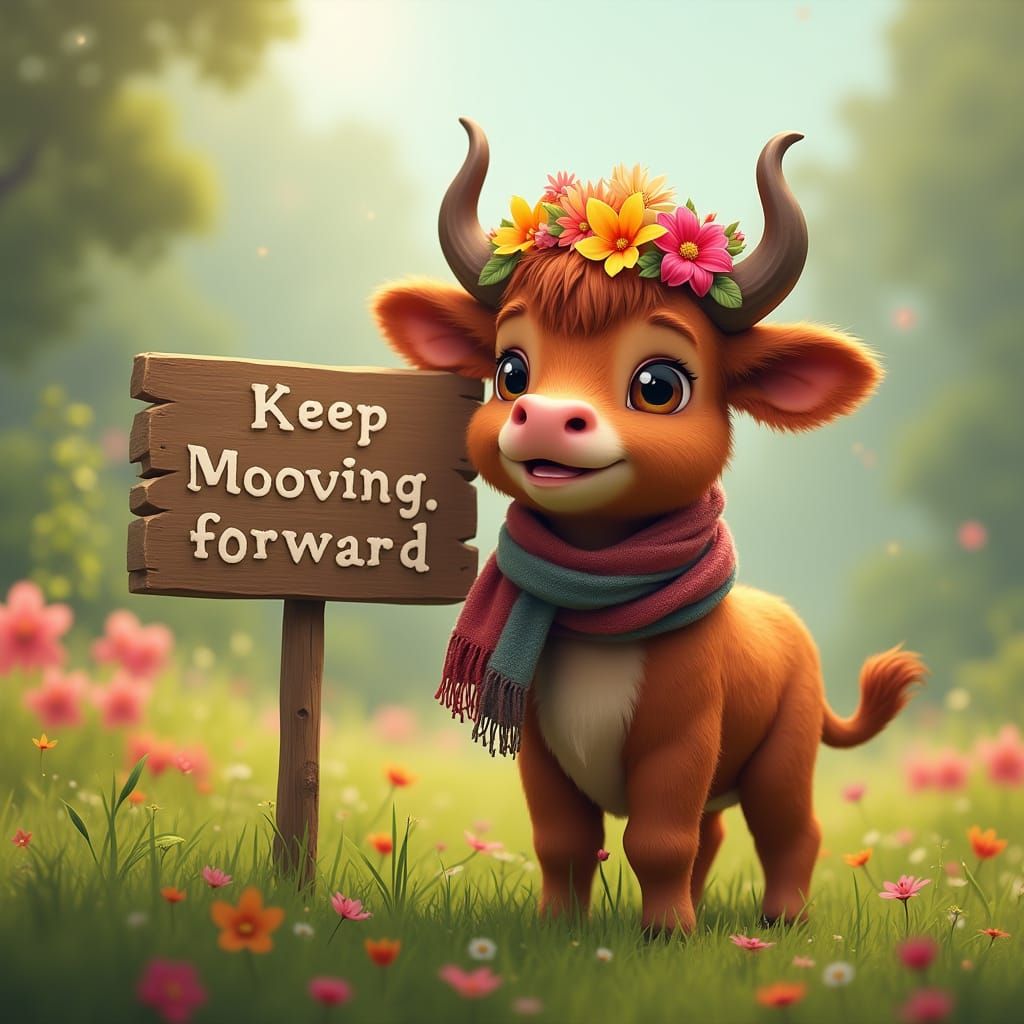 This image shows a baby highland cow in a vibrant meadow, adorned with a flower crown and scarf, holding a sign. The artwork features a detailed matte painting style with rich colors.