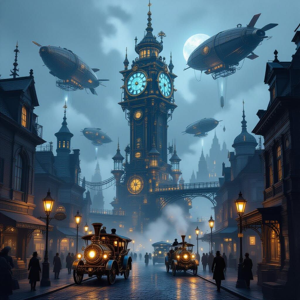 An elaborate steampunk city illuminated by warm gas lamps and glowing brass machinery, towering clockwork structures rising into a fog-filled night sky. Massive airships drift between iron sky-bridges, their propellers whirring with polished copper gears. The streets below bustle with Victorian-era inventors, ...