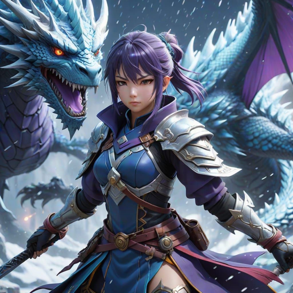 A stunning 3D anime artwork featuring a fierce female warrior battling a massive ice dragon amidst a snowstorm, with intricate frosty textures and moody, cinematic lighting.