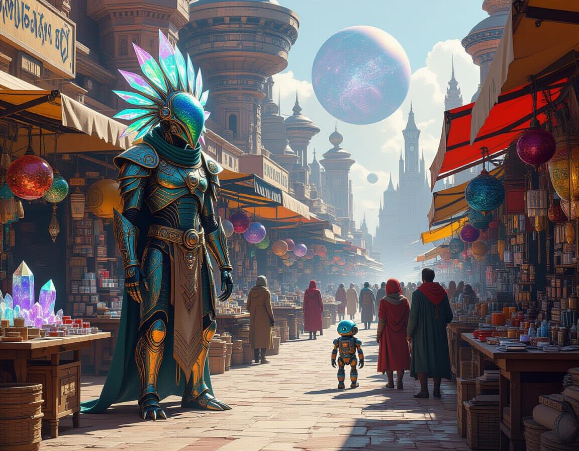 This image shows a vibrant marketplace on an alien planet filled with merchants and exotic goods. The scene is rendered with intricate details and dynamic composition in a hyperrealistic style. The aesthetic is reminiscent of concept art.