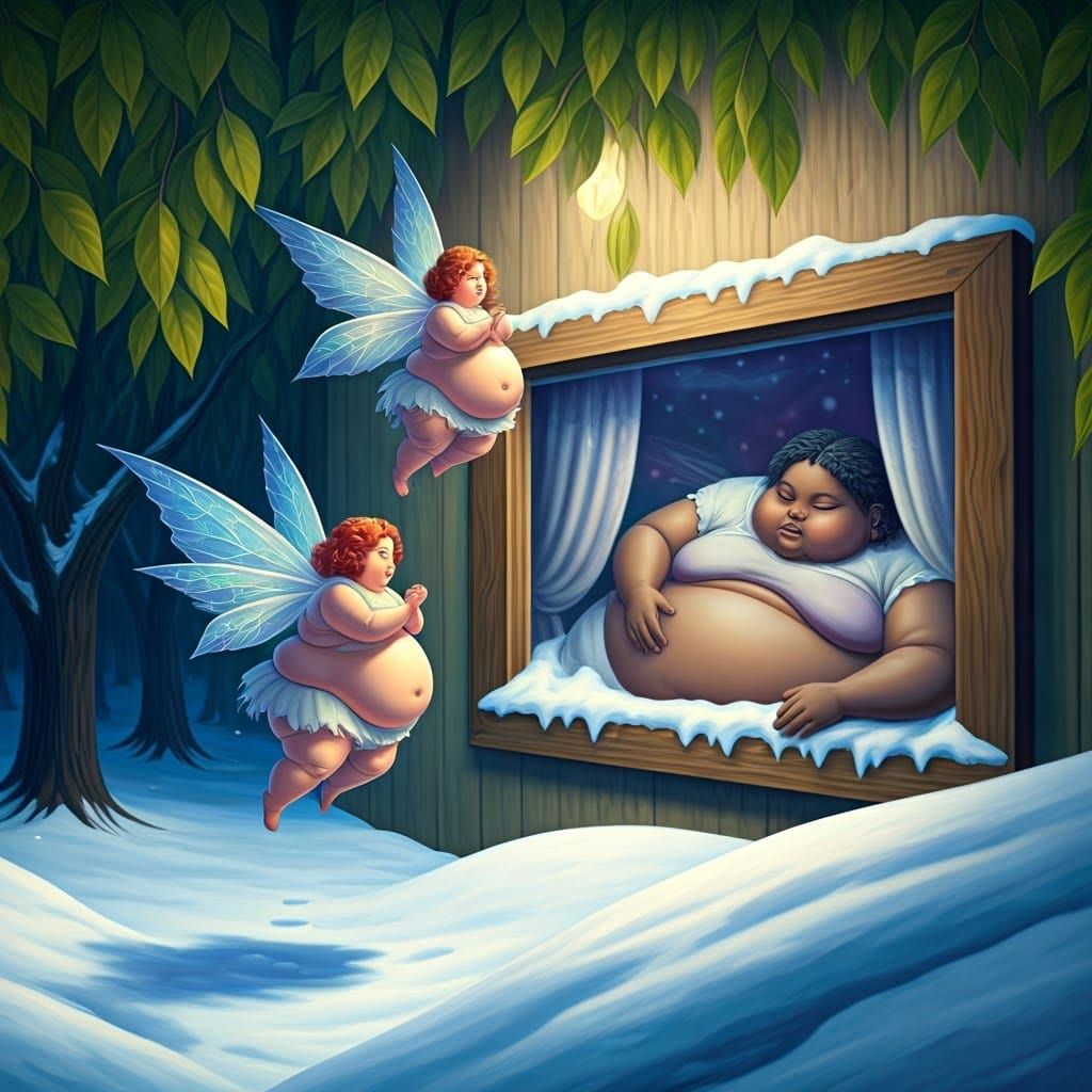 This abstract art piece captures two chubby fairies playing amidst young green leaves, surrounded by the warmth of spring, as a sleeping girl lies peacefully inside, set against a backdrop of melting snow and vibrant complementary colors.