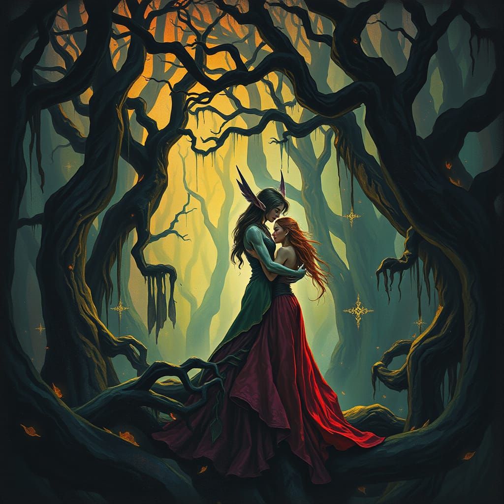 A vivid image of two elven lovers embracing in a dark, mystical forest. The scene features bright, ethereal colors against an ebony backdrop, with a heavily textured, otherworldly aesthetic.
