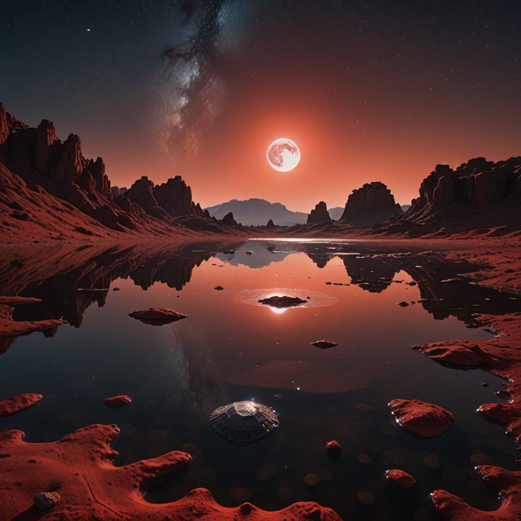 This image shows a metallic UFO emerging from a tranquil lake, reflecting a red moonscape. Strange rock formations dot the landscape under cinematic lighting, in a hyperrealistic digital art style.