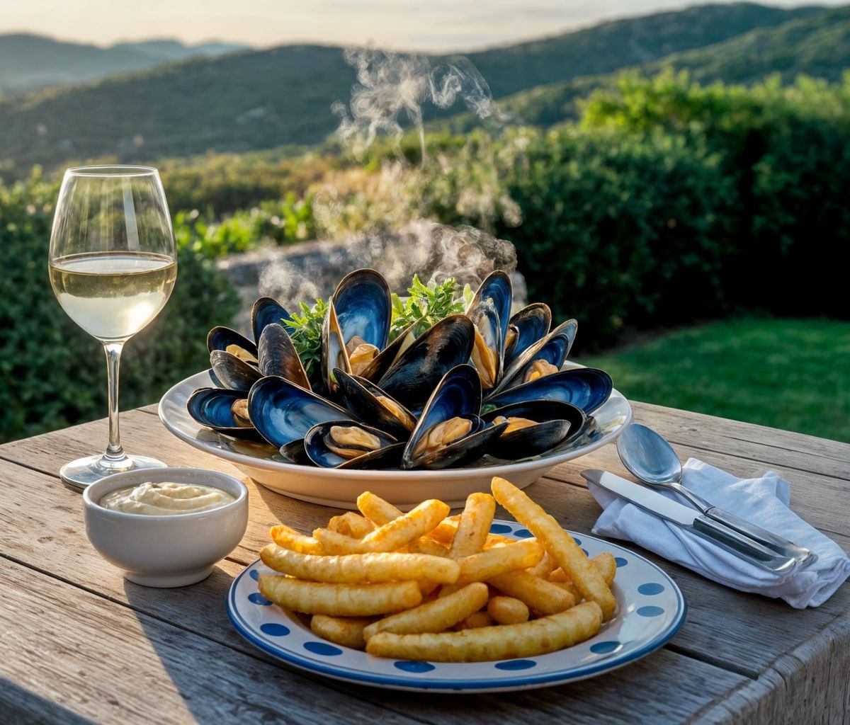 This image shows a beautifully presented plate of mussels alongside crispy frites, mayonnaise, and white wine. The food is set on a rustic table in a sun-drenched Corsican garden, creating an inviting culinary scene.