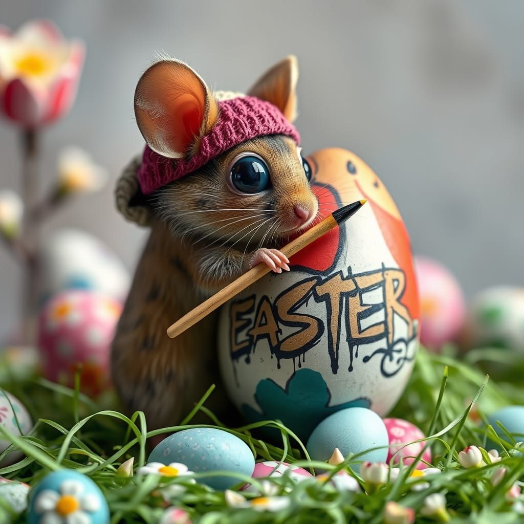 This image showcases a whimsical Easter egg decorated with intricate street art and graffiti, reminiscent of iconic artists like Banksy. A tiny mouse, dressed as a graffiti artist, brings this colorful scene to life.