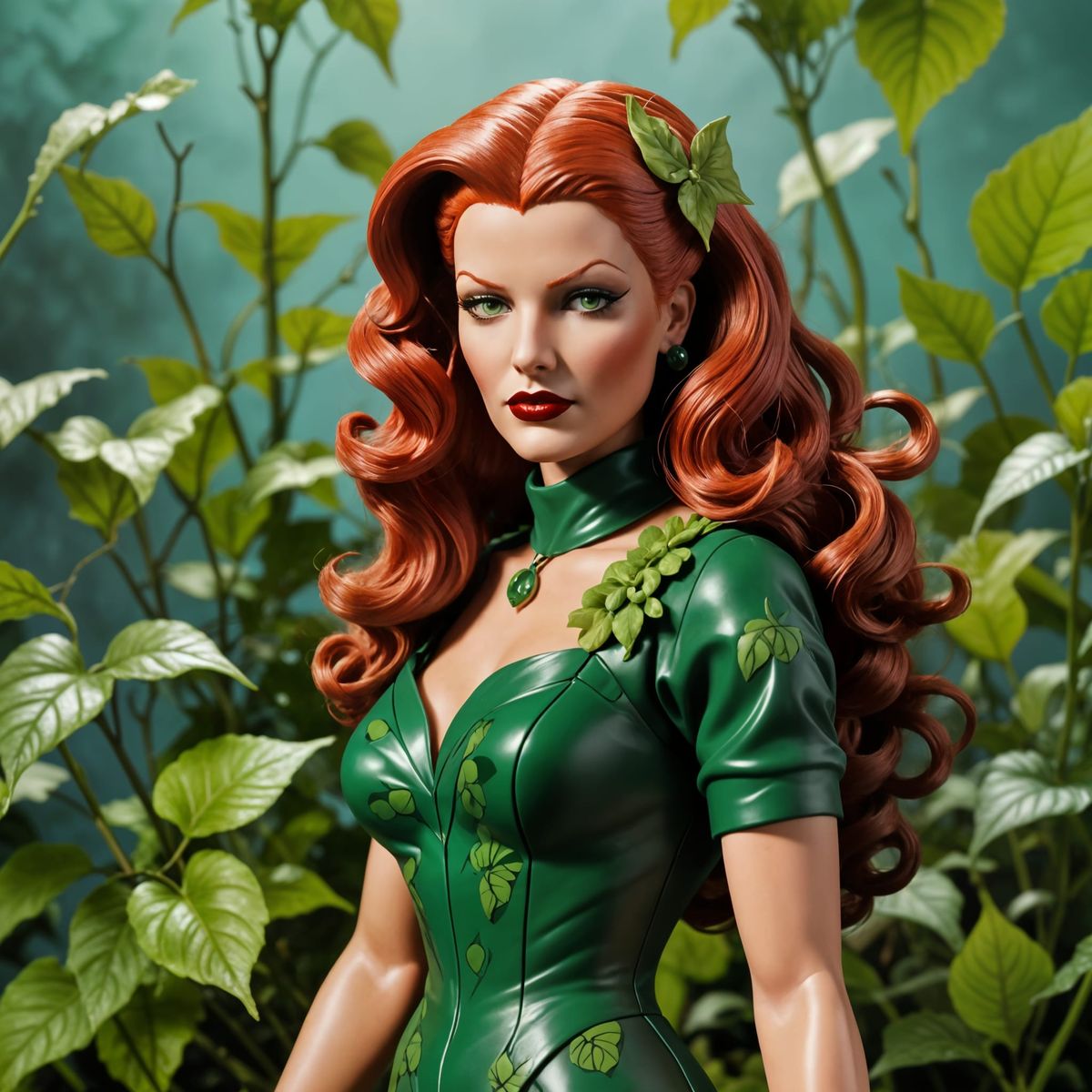 This image is a nostalgic depiction of a young Rita Hayworth as the iconic comic book character Poison Ivy, captured in a vintage action figure packaging aesthetic