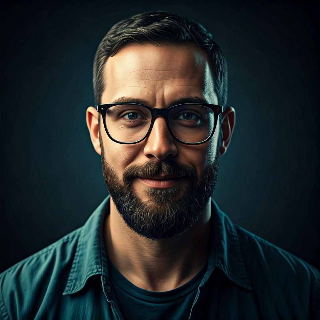 A cinematic portrait of a man in his 30s with a short beard and glasses, smiling warmly. The image features film grain, vignette, and a color grade with blues and golden tones reminiscent of film cinematography.