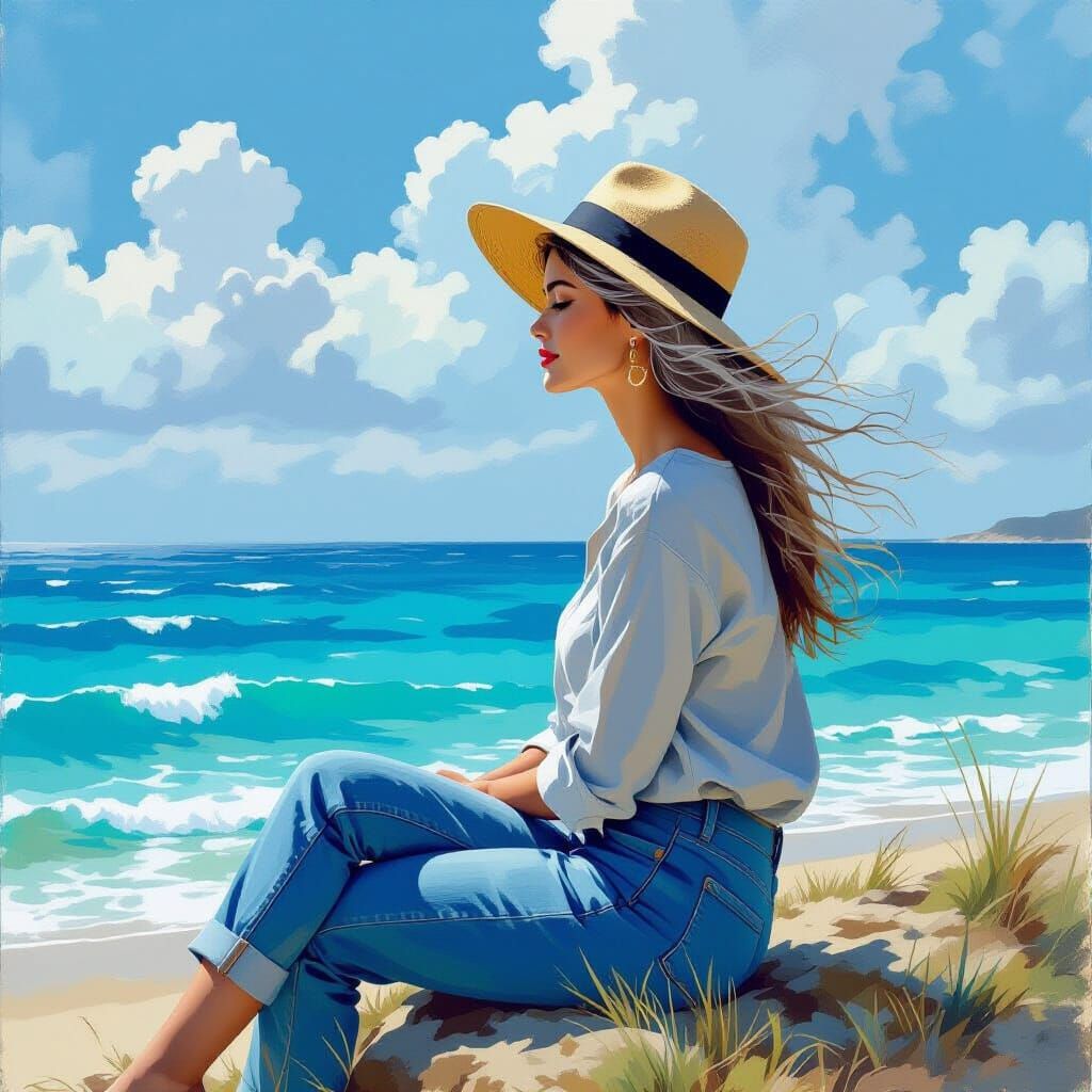 A digital painting of a woman with long gray hair sitting by a blue ocean. She wears a dark gray top, short jeans, and a golden hat, set against a bright landscape with white clouds in an art nouveau style.