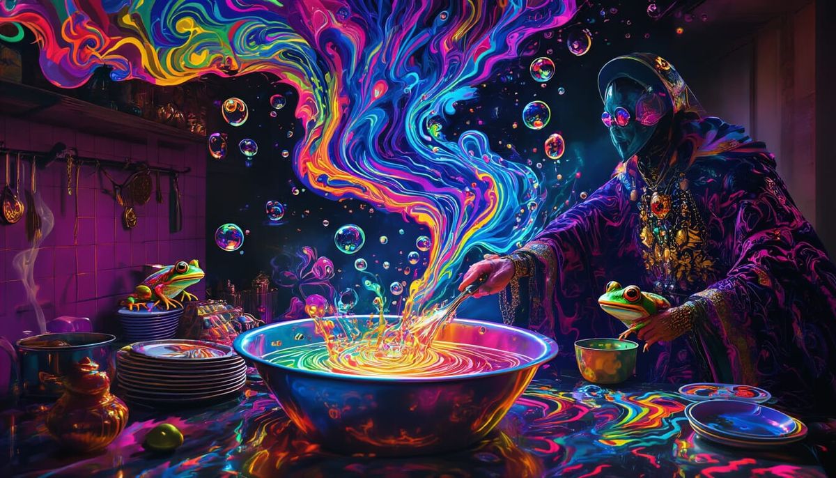 This image shows a powerful mage controlling dishes in an overflowing sink filled with iridescent alcohol. Vibrant colors, high contrast lighting, and surreal elements create a dreamlike, unsettling atmosphere.