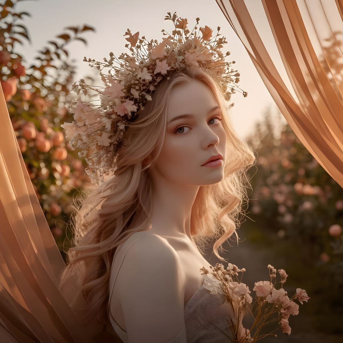 This image shows a serene portrait of a young woman with honey-blonde hair, wearing a wildflower crown. Captured in warm golden and peach tones, it evokes a dreamlike, nostalgic beauty.