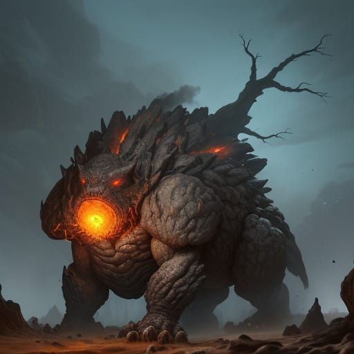 Lore & Behavior: Detonusk represent the final stage of the Burrowbom line, serving as living bulwarks and weapons of their colonies. They lie dormant beneath the soil for days, only surfacing when vibrations signal prey or intruders. Their bodies build explosive internal pressure; when heavily wounded, they may unleash a devastating self-destructive burst of earthen energy, leaving behind shattered soil and scorched stone. Ancient farmers once attempted to domesticate them as living landmines along borders, but most attempts ended in disaster when the beasts detonated too early.