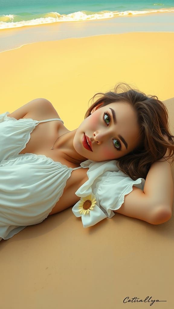 A serene image of a woman reclining on a golden sandy beach, gazing out at the turquoise sea. The artwork evokes the Romanticism and Impressionism movements.