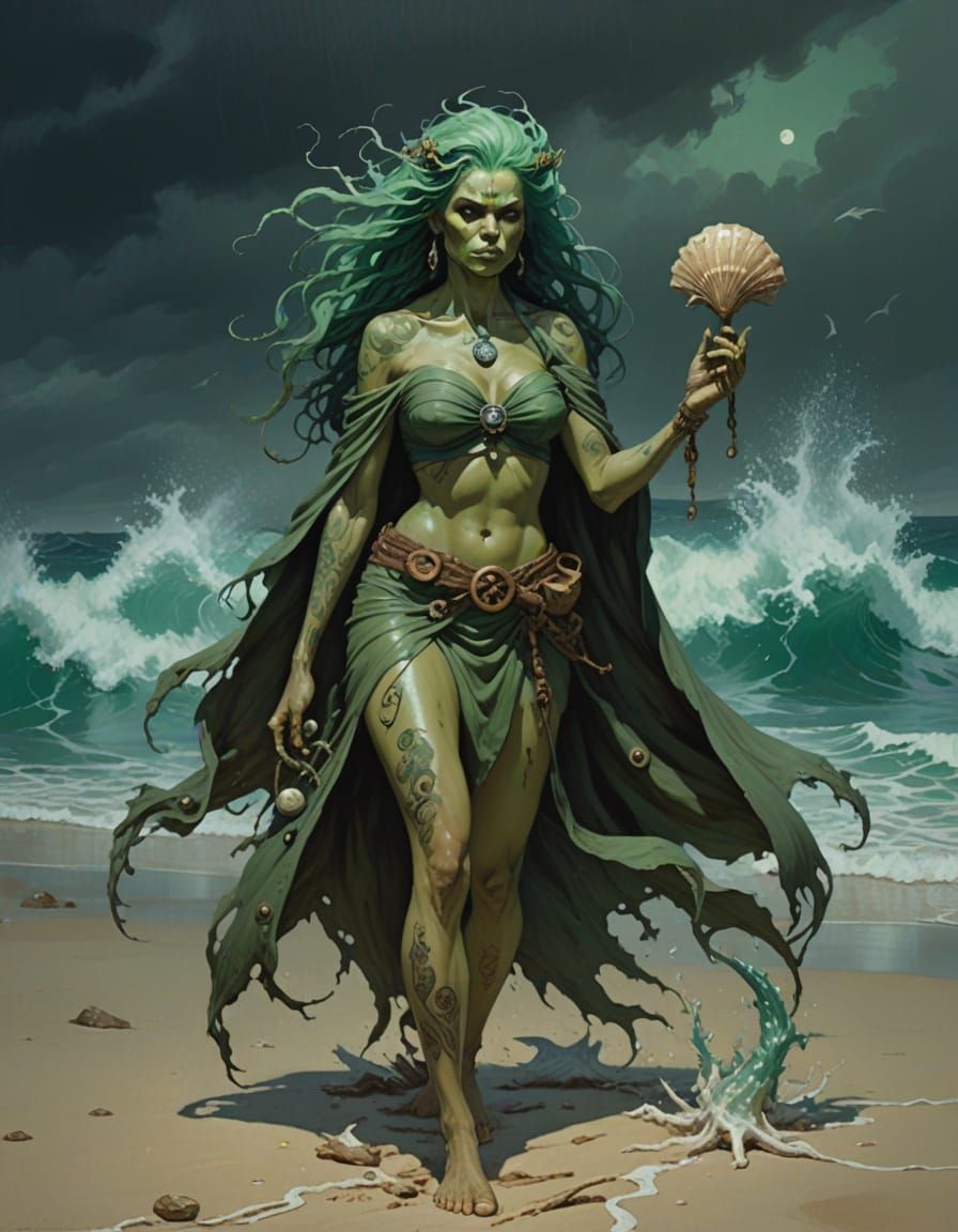 A striking image of a bronze-skinned sea witch with kelp-green hair and pulsing tattoos, adorned in driftwood and shells, in the powerful painting style of Frank Frazetta.