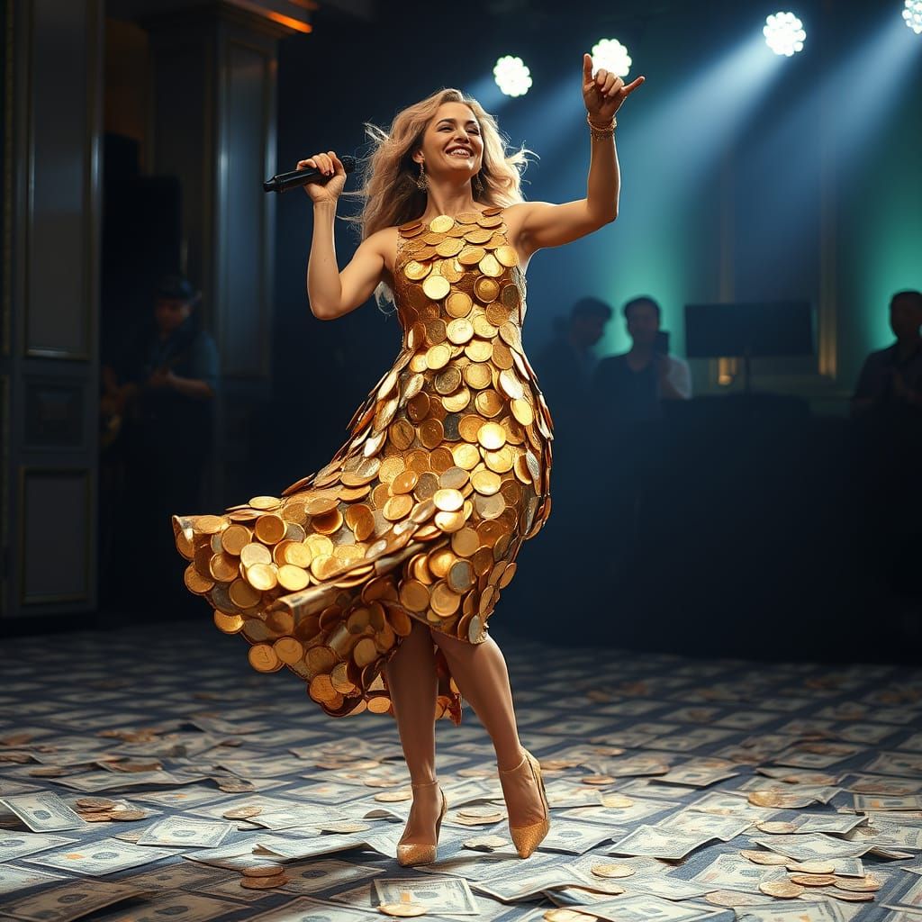 This image features a singer adorned in a dress crafted from gold coins, gracefully dancing on a floor covered entirely with dollar bills.