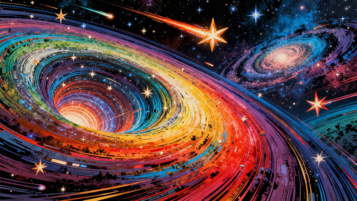 This image depicts a high-velocity, 3D vortex tunnel maelstrom of star creation, filled with colorful astral objects in a Moebius-inspired science-fiction painting style.