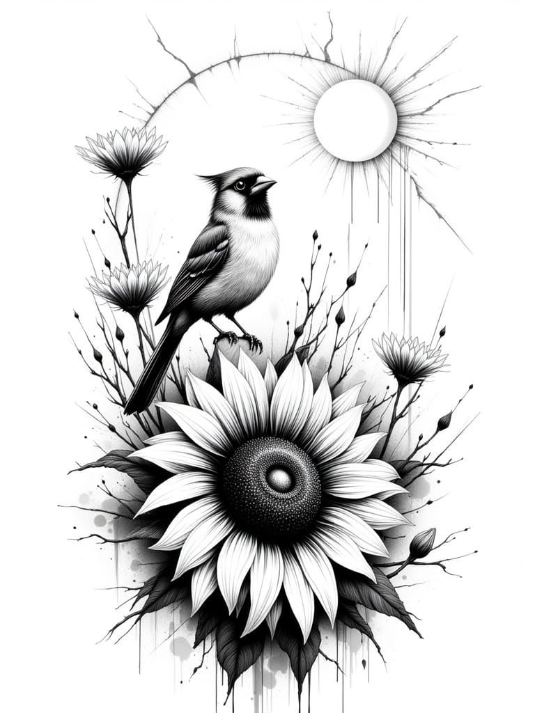 A black-and-white tattoo-stencil of a cardinal perched on a sunflower (horizontally aligned; outline-conforming; stylized light-waves and sun-beams). Maximum white-space; minimalist lines <lora:XenoPin 2p0:0.4> <lora:Twisted Ink v2:0.3> <lora:Ink Poet:1.0> <lora:-Omnious-:1.0>