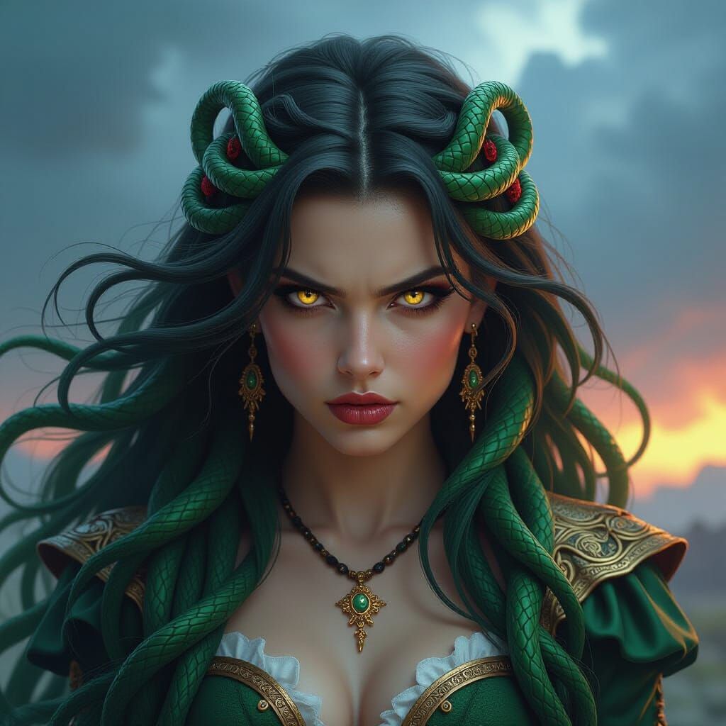 Generate your own powerful fantasy Medusa images with flowing green, snake-like hair. Free and easy AI art creation.