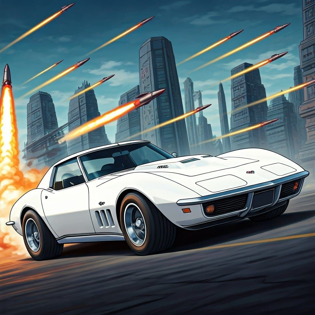 This striking image showcases a sleek, futuristic white Corvette Stingray, set against a gritty, neon-lit cityscape with towering skyscrapers and rockets blasting off into the sky, blending traditional Japanese manga aesthetics with a cyberpunk edge and nostalgic retrofuturism.