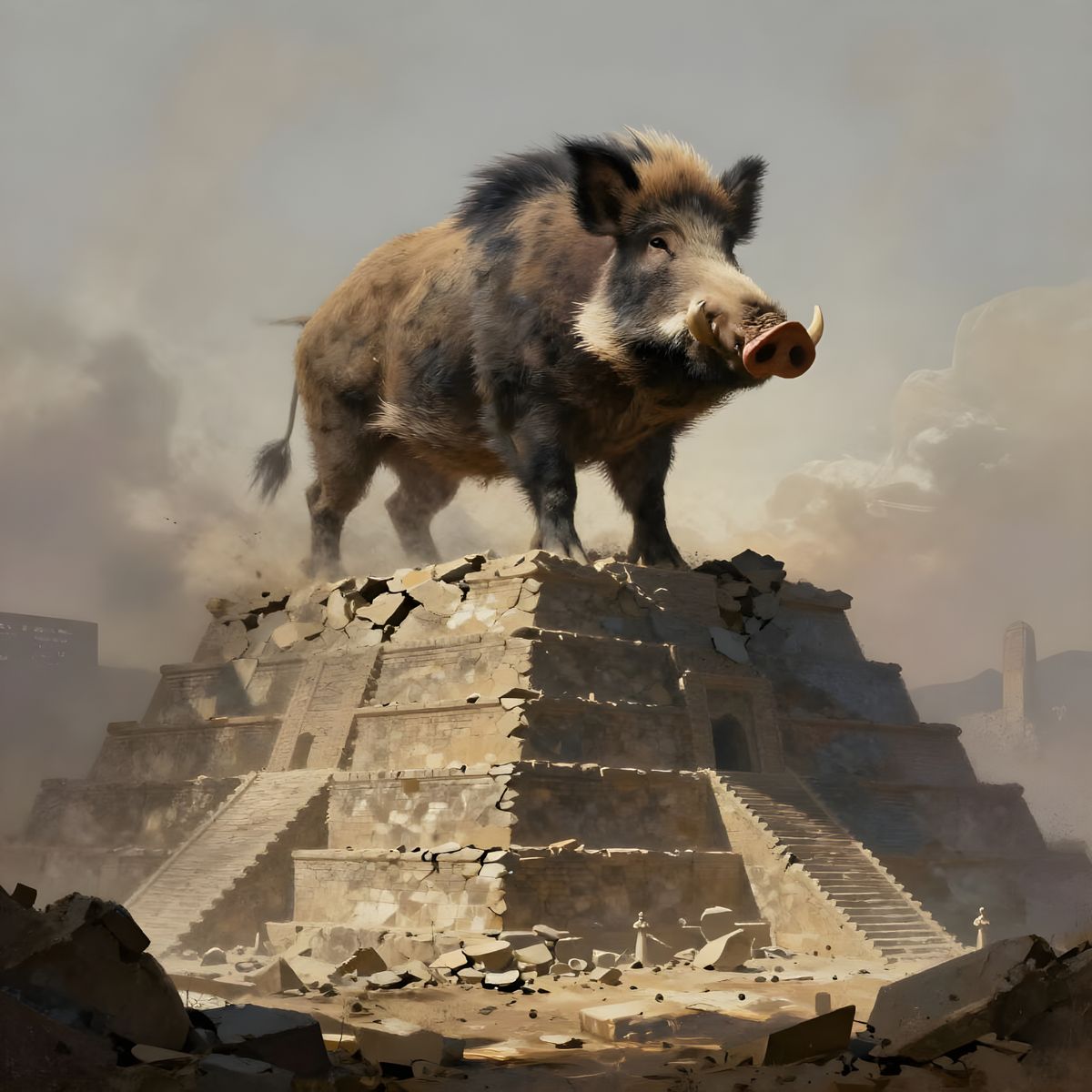 A colossal wild boar surveys a desolate, post-apocalyptic world from a crumbling ziggurat, shrouded in a dreamlike haze with dramatic cinematic lighting.