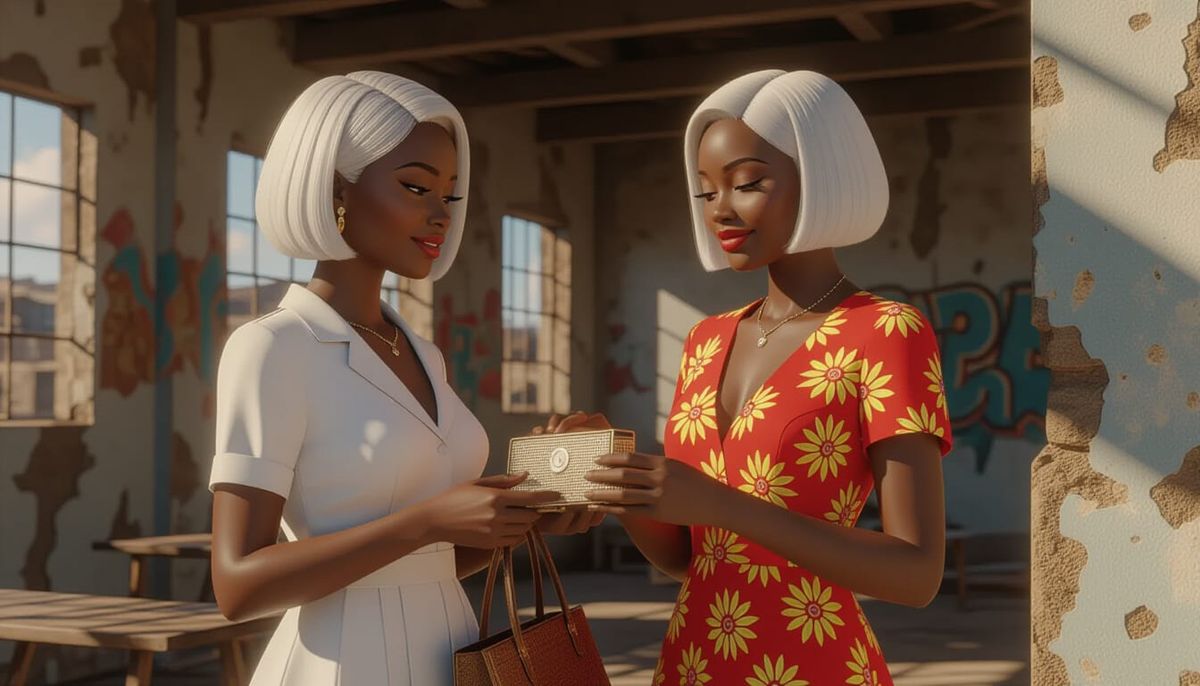 This image shows a hyperrealistic animated style portrait of two African women in their 20s. One presents a bag while the other examines it, set in an unfinished building with dramatic 3D shading and deep shadows.