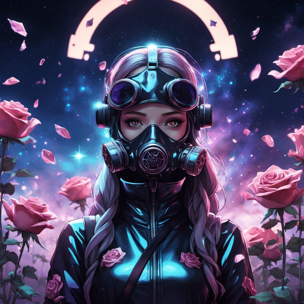 This image depicts a stunning sci-fi concept art scene. A girl in a gas mask stands within a galaxy shaped like a fleur-de-lis, surrounded by roses and cash. Iridescent colors and neon hues glow in the dark, creating a breathtakingly detailed and elegant composition with futuristic vibes.