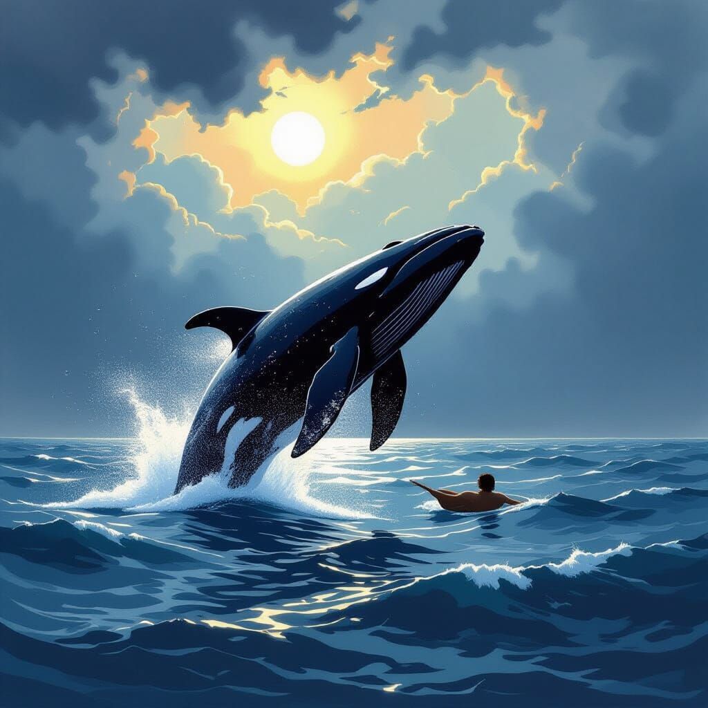 Lino cut. A majestic whale breaching from a stormy, dark sea on one side, and the same whale peacefully swimming in a calm, sunlit ocean on the other. High contrast, dramatic lighting, intricate details, painterly touch, ethereal, masterpiece. A split image showing the duality of nature's power and serenity. ...