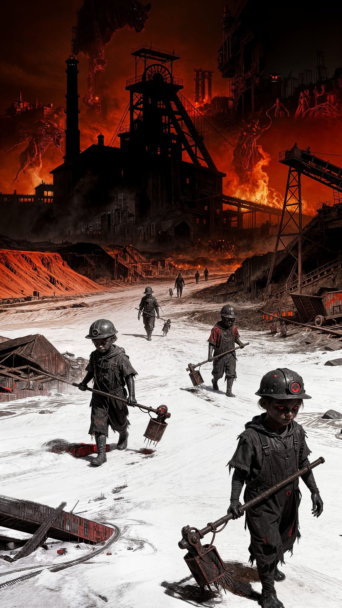 This surreal artwork depicts a dark, gothic factory and mine with hellish demonic backgrounds. Small, child-like creatures in worker attire explore the red and black landscape.