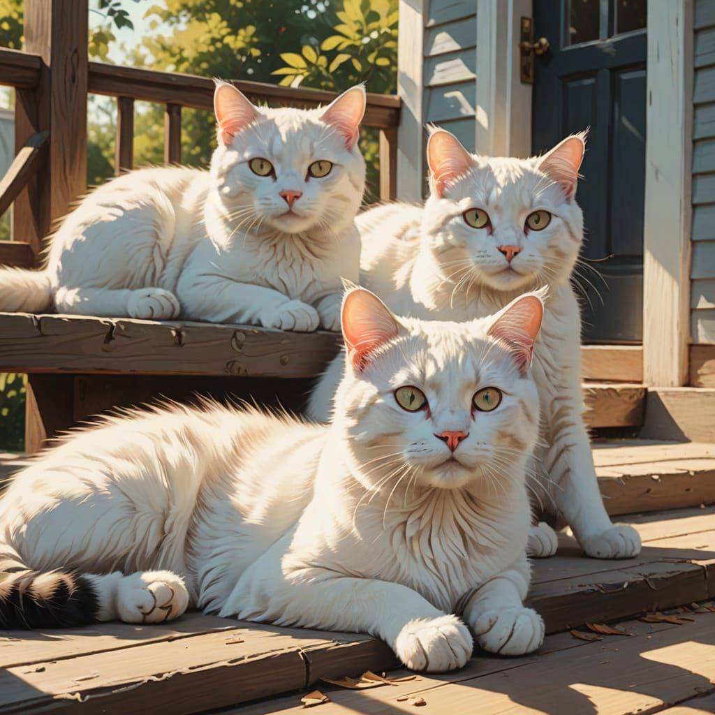 This image shows several white cats with black stripes resting on a porch. The digital painting features soft fur, twitching whiskers, and warm sunlight with a pastel color palette.