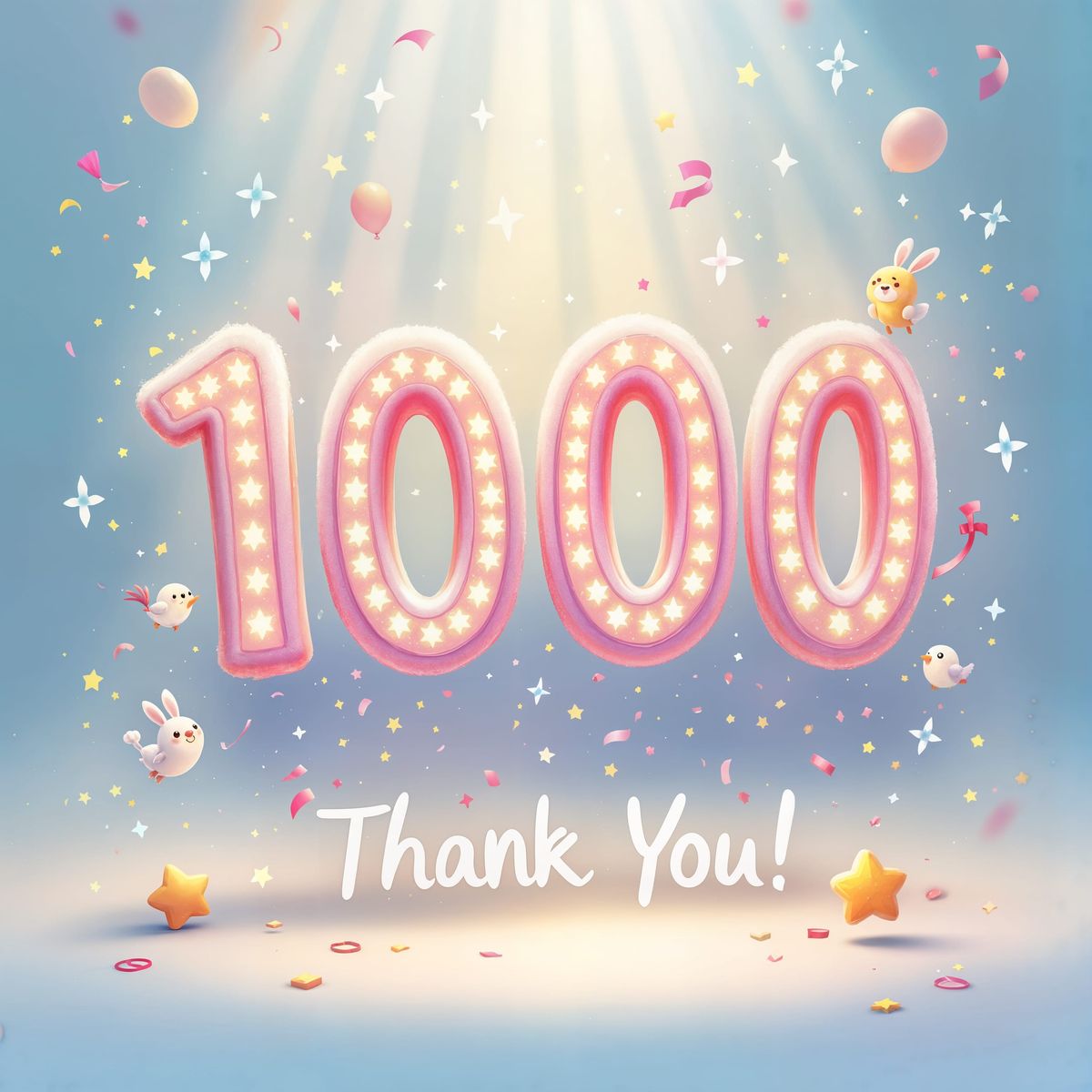 A heartwarming illustration of a joyful central character surrounded by a soft pastel background, colorful confetti, and gentle light rays, celebrating 1000 followers with a decorative '1000' display
