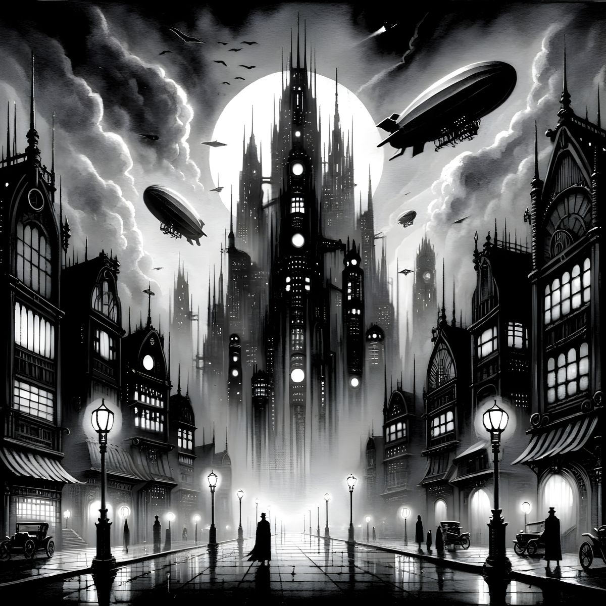 A haunting grayscale watercolor image of a dystopian cityscape at night, blending gothic and science fiction elements with a sense of mystery and dread.