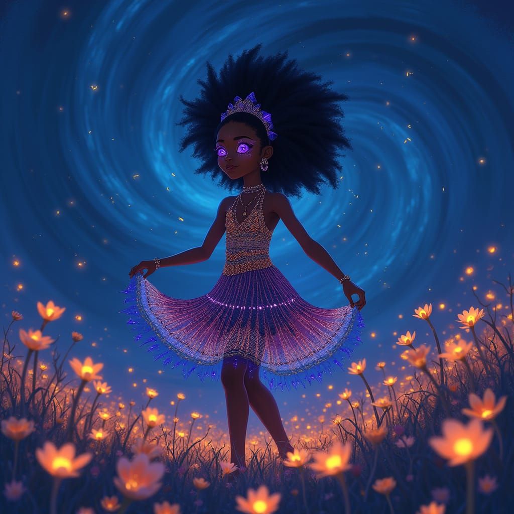 A vibrant image of a young African girl dancing in a field of glowing flowers. The girl wears tribal face paint and a dress of woven starlight, set against a swirling nebula sky in an afrofuturist aesthetic.