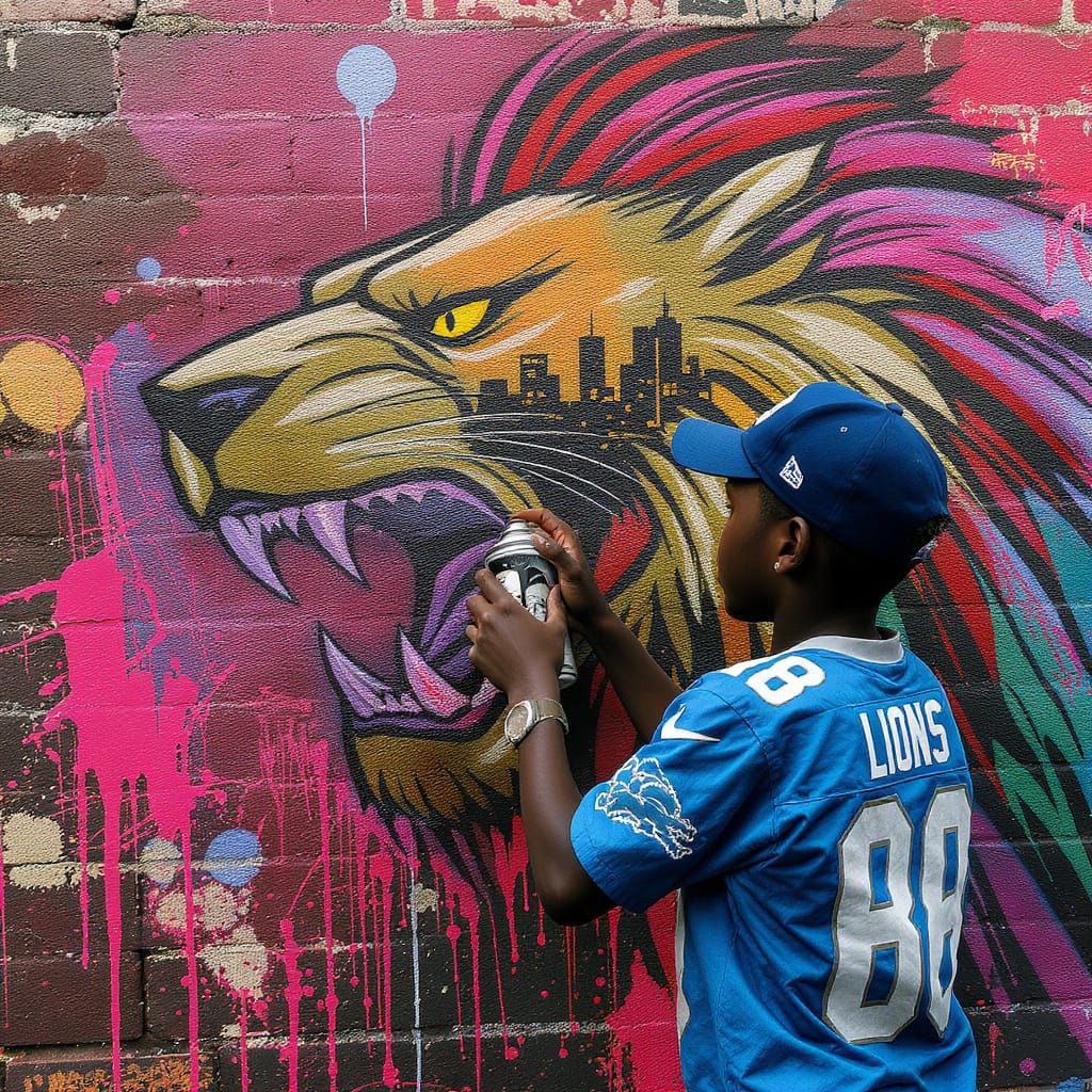 This image shows a young Black boy in a Detroit Lions jersey spray painting a mural. The vibrant urban realism style features bold graffiti strokes and colors, with the Detroit skyline inside the lion's mouth.