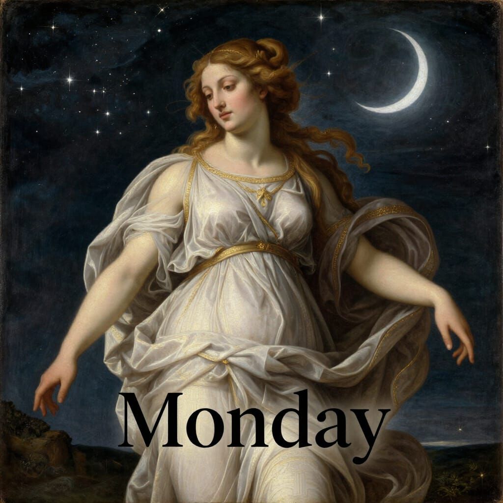 A magnificent Renaissance oil painting showcasing the Roman goddess Luna with a serene aura against a celestial night sky. Golden hour light illuminates her ethereal gown in a style reminiscent of Leonardo da Vinci.