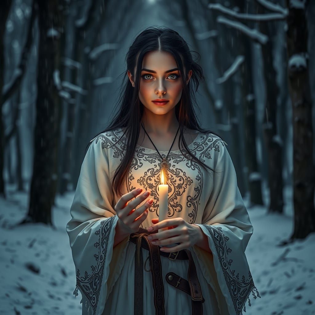 A hyperrealistic image of a woman warrior in a medieval dress holding a candle in a snowy forest. The atmospheric image evokes HDR photography with cinematic lighting and sharp focus.
